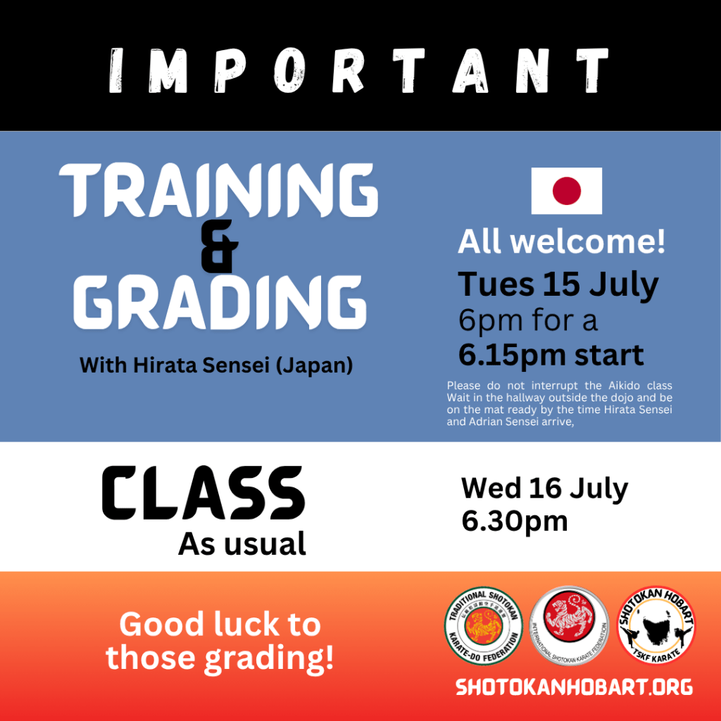All students are encouraged to attend if possible as this will be a combined training and grading. That means even if you aren’t doing a belt exam, you will still benefit from Hirata Sensei’s teachings.
