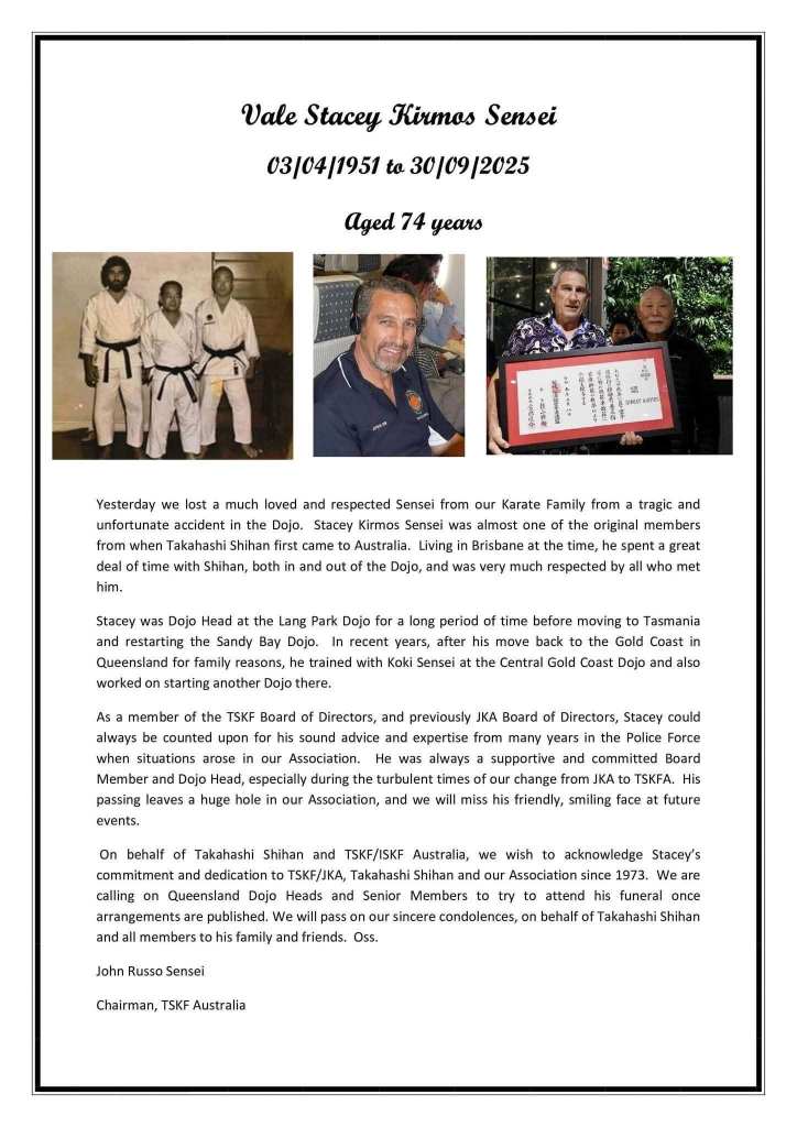 Australian Karate legend Stacey Kirmos tragically passed away on 30 September 2025 in Queensland, Australia. TSKF Tasmania was founded by Stacey Sensei in 2015 and has seen many students thrive under his leadership. The family has asked that donations be made to Queensland Police Legacy in lieu of flowers.
